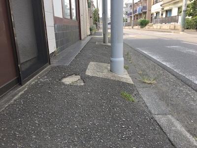 主な歩行部分のアスファルトはおおむね平らですが、縁石付近の継ぎ目や溝、荒れたり砂利状になった端部のせいで杖の先が不安定になり、つまずく危険が高まっています。