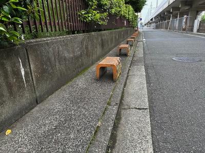 歩道は一方に高い壁があり、もう一方に車止めの列と歩道中央付近の電柱があるため、少なくとも一部の区間では一列でしか通行できなさそうな狭い場所ができています。